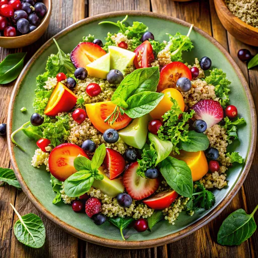 Taze avokado dilimleri ile harmanlanmış kinoalı salata, rengarenk sebzelerin ferahlatıcı bir uyumunu sunar.